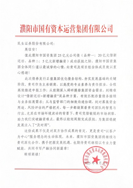 濮阳市国有资本运营集团有限公司在感谢信中表示:“此次债券发行正值集团优化债务结构、夯实发展基础的关键阶段。贵司作为主承销商,以高度的专业素养与责任担当,全程高效推进申报工作:从前期深入调研摸排集团资金需求,到精准设计 ‘借新还旧+新增融资’双品种方案,有效匹配存量债务接续与业务拓展需求;从与监管部门的细致沟通协调,到对募集资金用途、风险评估的严格把关,每一步都凝聚着贵司团队的智慧与付出。尤其在市场环境波动的背景下,贵司凭借敏锐的市场洞察助力我们突破融资难点,最终以较短周期完成获批,为集团稳健发展注入‘及时雨’。”。